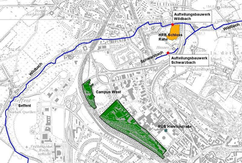 Der Bau- und Liegenschaftsbetrieb Nordrhein-Westfalen (BLB NRW) plant um den Westbahnhof Aachen herum die Entwicklung des Campus West. Bis 2015 sollen dort sechs Kompetenz-Cluster für den RWTH Aachen Campus entstehen. Die Erschließung des Campus West hat Auswirkungen auf die wasserwirtschaftlichen Verhältnisse im Schwarz- und Wildbach. Die Planung bedingt gegenüber dem heutigen Zustand eine Erhöhung der versiegelten Fläche. Es ist vorgesehen, das Niederschlagswasser aus dem Campus-Gelände über den Schwarzbach in den Wildbach zu leiten. Für das unterhalb des Campus West gelegene Einzugsgebiet darf sich keine Verschärfung der Verhältnisse im Hochwasserfall ergeben. Im Rahmen des Projektes wurden der heutige Zustand und der Prognosezustand nach Umsetzung des Campus West untersucht und vergleichend gegenübergestellt. Zu diesem Zweck wurde das im Rahmen des Hochwasseraktionsplans Wurm erstellte Niederschlag-Abfluss-Modell zur besseren Beurteilung von Detailfragen verfeinert und eine hydrologische Untersuchung zur Bestimmung von Bemessungsabflüssen durchgeführt. Im Anschluss daran wurden Maßnahmen zur Sicherstellung des Hochwasserschutzes und einer gewässerverträglichen Einleitung entwickelt und untersucht.
