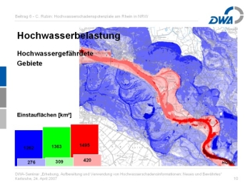 Herr Rubin berichtet über eines der wichtigsten Projekte im Bereich der Hochwasserschadenspotenzialermittlung, die Ende der 90er Jahre im Auftrag des Umweltministeriums des Landes Nordrhein-Westfalen im Rahmen eines Forschungs- und Entwicklungsprojektes durchgeführte Studie zur Ermittlung und Abschätzung der Hochwasserschadenspotenziale am Rhein in Nordrhein-Westfalen. Die Zielsetzung dabei war es, Angaben über die Größe der Hochwasserschadenspotenziale sowie deren räumliche Verteilung im ehemaligen Überschwemmungsgebiet des Rheins zu machen und Aussagen darüber zu treffen, mit welchen Schäden in welchen Bereichen gerechnet werden muss, falls Hochwasserschutzanlagen versagen oder das Bemessungshochwasser überschritten wird. |