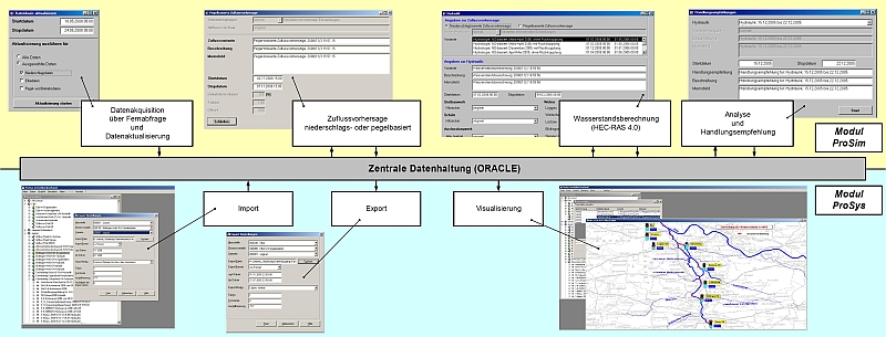 Die ProAqua Ingenieurgesellschaft wurde vom Jeetzeldeichverband beauftragt, dieses Steuerungsmodell zu erstellen. Die wesentlichen wasserwirtschaftlichen Rahmenbedingungen (Abflüsse, Wasserstände) werden durch ein Niederschlag-Abfluss-Modell und ein hydraulisches Modell ermittelt. Das zu betrachtende Einzugsgebiet der Jeetzel hat eine Größe von ca. 2.000 km². Das hydraulische Modell deckt die Fließstrecke von Sienau bis Hitzacker ab. Das Steuerungsmodell ist eine Access-Anwendung, deren Datenhaltung auf einer ORACLE-Datenbank fußt. Das Steuerungsmodell beinhaltet u.a. Module zum automatischen Datenabruf (Niederschlags-, Klima- und Steuerungsdaten) und zur Datenaufbereitung. Es können Abfluss- und Wasserstandsberechnungen durchgeführt werden. Diese Berechnungsergebnisse können analysiert und eine Handlungsempfehlung zur Steuerung der Bauwerke erstellt werden. Eine Archivierung der Daten ist zur Beweissicherung möglich. |