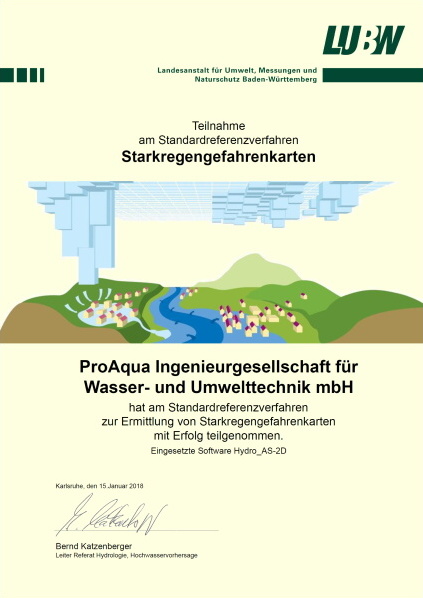 ProAqua bearbeitet seit 2015 Projekte zum Starkregenrisikomanagement für bisher acht Kommunen in Baden-Württemberg (Bad Bellingen, Erbach, Ochsenhausen, Hochdorf, Mietingen, Ingoldingen, Lonsee, Biberach), dabei werden alle Phasen gemäß dem Leitfaden behandelt. Grundlage für die Starkregengefahrenkarten sind zweidimensionale instationäre hydronumerische Berechnungen mit HYDRO_AS-2D. ProAqua hat am Standardreferenzverfahren zur Ermittlung von Starkregengefahrenkarten mit Erfolg teilgenommen. Diese Standardreferenz ist in Baden-Württemberg ab 2018 Voraussetzung für die Förderung der Konzepte zum Starkregenrisikomanagement. |