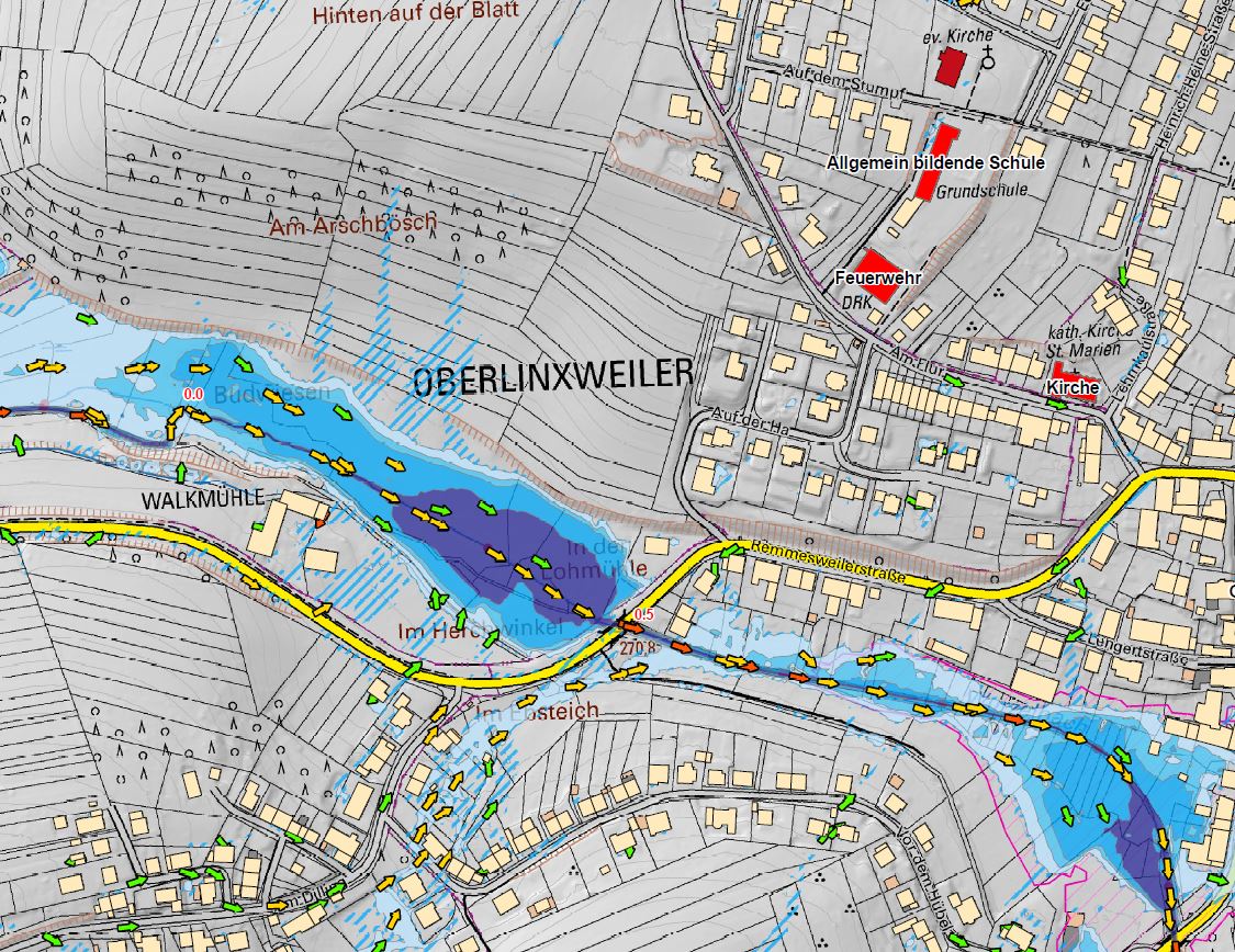 Des weiteren werden nach einer Bereisung des Untersuchungsgebietes Hochwasser-Gefahrenkarten auf Grundlage des Leitfadens "Hochwasser-Gefahrenkarten, Stand 2003" für verschiedene Lastfälle erarbeitet. |