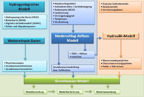 Neben reinen Grundwassermodellen setzt ProAqua auf eine interdisziplinäre Betrachtung von Grundwasser und Oberflächengewässern. Hierfür werden 3D-Grundwasserströmungs-Modelle mit 2D-Hydraulik-Modellen und Niederschlag-Abfluss-Modellen gekoppelt.